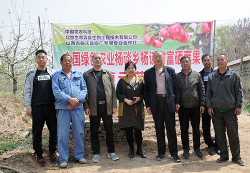 据山西省临汾市曲沃县杨谈乡杨谈村村长吴红喜(左三)介绍,杨谈乡是曲沃县唯一的山区乡,杨谈村的主导产业以苹果种植为主。在党员干部的带动下,全村苹果面积由原来的800余亩发展到现在的近2000亩。为了更好地为发展杨谈特色苹果的种植、销售,专门成立了曲沃县宏广苹果专业合作社,与北京生命源泉生物工程有限公司董事长李林奇合作,是他几经实地调研考察才下的决定。