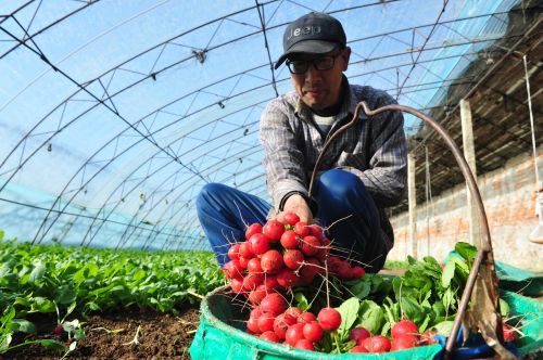 26日,鞍山经济开发区宁远镇小台子村菜农段志伟正在收获樱桃小萝卜,应用了富硒肥料后,段志伟家的樱桃小萝卜色彩鲜艳,品质优良。据介绍,富硒肥料是该镇农业部门推广的一种新型肥料,该肥料具有针对性强、吸收快、效果好、用量省等优势。目前,樱桃小萝卜在市场上供不应求。